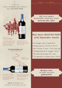 Toevoegen aan verlanglijst Toevoegen aan vergelijkenDe Crusted port vormt een mooie aanvulling op de meer bekende Vintage port en de Late Botteled Vintage port. Crusted port wordt gemaakt van een blend van verschillende ports die de kwaliteit hebben van een Vintage port en afkomstig zijn van 2 of 3 oogstjaren. Deze ports hebben ieder afzonderlijk een rijping op kleine eikenhouten vaten ondergaan voordat ze worden samengevoegd. De Crusted port wordt niet geklaard en gefilterd, waardoor aroma’s zoveel mogelijk worden behouden en de wijn een mooie complexiteit opbouwt. Na botteling rijpt de wijn nog 3 jaar op de fles.